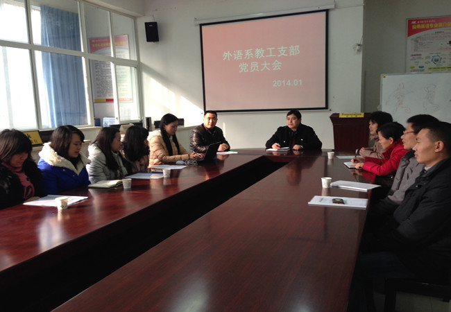 2014年1月17日上午,外语系教工支部组织党员教师开展“辞旧迎新”总结暨2014年度工作安排会议。首先,曾德贵、刘永丽和周瑜三位同志分别对外语系党总支、教工支部和员工支部工作进行了总结。党员同志们纷纷就2013年外语系的党建工作提出了意见和建议,大家认为2013年外语系党建工作取得了一定成绩,理论学习和支部活动开展较之前有所加强,希望支部在2014年能够进一步完善党员发展工作,丰富支部活动形式。