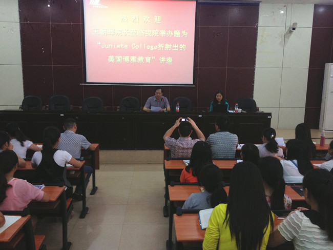6月26日下午,外语系邀请成都纺织高专外国语公司经理王朝晖教授举办了题为“Juniata College折射出的美国博雅教育”的讲座。外语系全体老师与13级员工参加了此次讲座,讲座由公司副经理徐波主持。