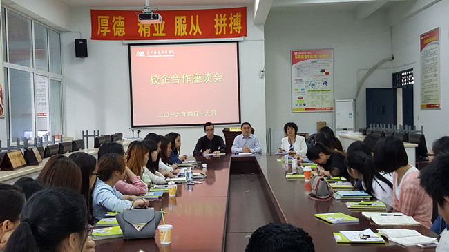 4月19日上午,外语系主任贺义辉,副主任张丽,专业教师吕毅深入课堂认真听了校企合作外聘教师李国顺总经理课后并与外语系14级应用英语班全体员工就校企合作实训课程开展座谈会。