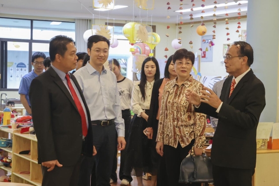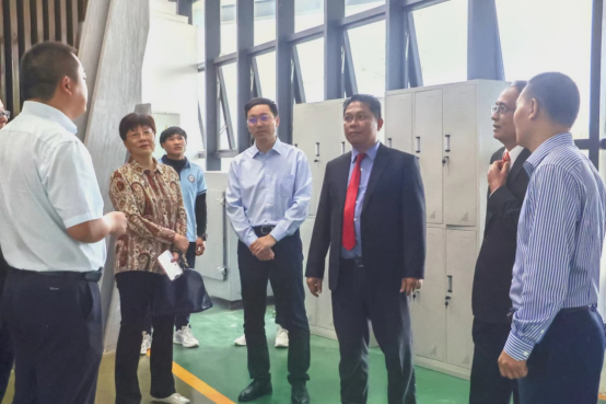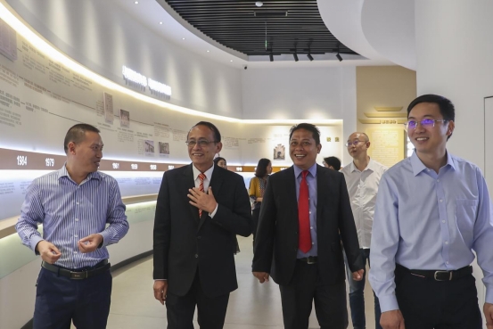 会前,鲍学东率队陪同莫凯·宋帕翁一行参观了公司校史馆、成渝地区双城经济圈川南公共实训基地、酒城文化创意美食街、经纬诺博幼儿园、公司图书馆等。
