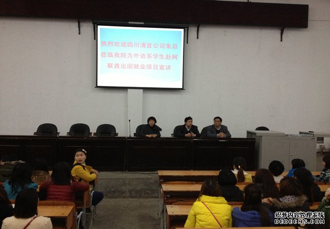 2月27日晚,外语系邀请国际信息化人才商务服务外包西南地区总代理、四川省清宜有限公司董事长兼总经理朱绍清在公司萧秋厅对外语系出国就业项目进行宣讲。外语系主任贺义辉、副主任张丽、党总支副书记曾德贵以及2010级、2011级辅导员老师和员工参加宣讲会。