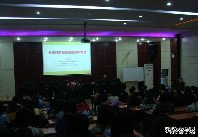 阳春三月,经过精心筹备,外语系学术月活动也在如火如荼的进行。3月18日晚19:00-21:00, 公司聘请了四川外语公司博士、研究生部主任、中国辞书学会双语词典专业委员会常务理事、中国外语界面研究学会常务理事、国家社科基金项目评审专家王仁强教授就外语科研创新的方法和途径进行了精彩的讲座。公司科研处温怀玉处长主持会议,外语系所有教师,四川警察公司、泸州医公司、化专部分教师,以及公司2011级英语教育专业所有员工参加了此次讲座。