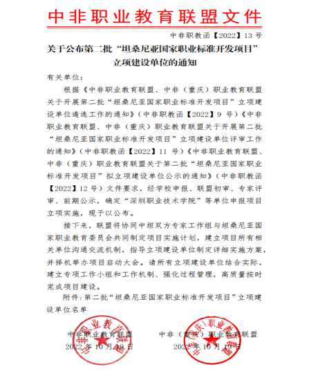坦桑尼亚国家为了健全和完善相关行业职业标准和职业教育体系,他们针对国家重点行业职业技能岗位,优选中国同等数量的职业标准,经本土化修订后,按照坦桑尼亚国家相关流程注册认证,与配套专业教学标准一并纳入坦桑尼亚国家职业教育体系,指导坦桑尼亚国家职业院校开展人才培养工作。