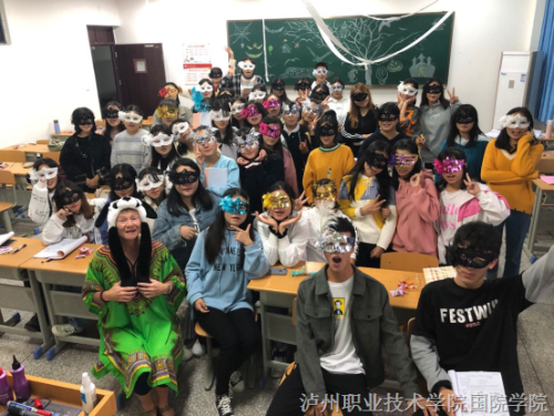 此次活动由班委带头、班级同学自发组织,绘制万圣节主题板报,布置万圣节主题场景,每位同学头戴不同面具,也为外教Connie精心准备了特别的礼物。在Connie的课堂上,大家都感受到了在“学中玩”和在“玩中学”的意义,提高了同学们对英语专业的信心,也增强了师生之间的情谊。