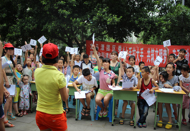 6月23日,队外语系“梦之行”服务队又开展了第二部分的活动——即联合龙马潭区团委,开展了主题为“小手拉大手,共筑文明梦”的亲子互动活动。本次活动在龙祥社区的居委会的协助下,队员们走进社区,邀请了社区的小朋友和家长共同参与。