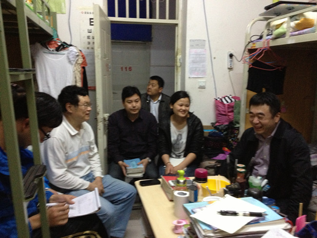 2014年5月8日晚7时,公司党委书记代华龙带领心理健康专家李自璋教授、院办王亮,冒着大雨深入员工一线---员工寝室,主动关心员工,为员工排忧解难。