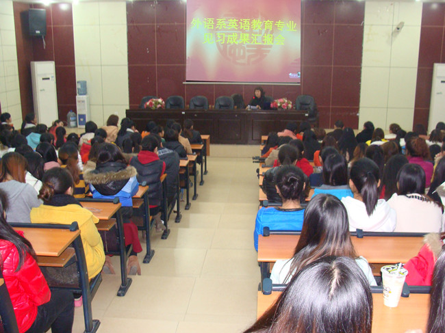 12月6日晚,外语系全体教师及英语教育专业11级、12级全体同学在求实厅召开了英语教育专业见习总结汇报会,就本学期11月份为期一周的见习活动作总结汇报。此次汇报共有13位同学发言,涉及泸州师范附小等5所泸州知名学...[详细]