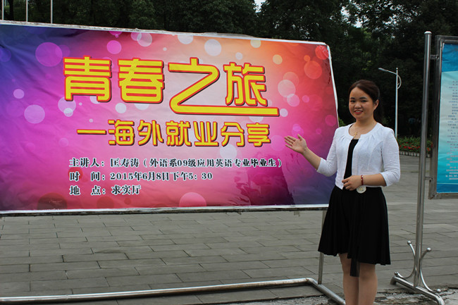 2015年6月8日下午5:30,外语系邀请09级应用英语专业毕业生匡寿涛在求实厅为13级全体同学以及14级应用英语班的同学做了一次《青春之旅》的海外就业分享交流会。交流会上,匡寿涛结合自己在迪拜的就业经历,从面试前的...[详细]