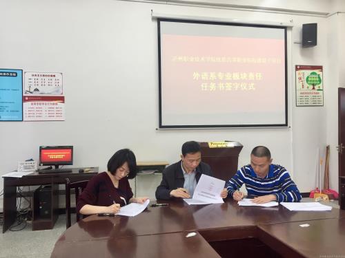 4月16日下午,外语系在3420举行了优质校建设专业板块任务书签字仪式。外语系领导、英语教育和应用英语两个专业的负责人及全体专业教师参加了会议。会上,系党总支书记梁杰同志代表系部与英语教育、应用英语两个专业的...[详细]