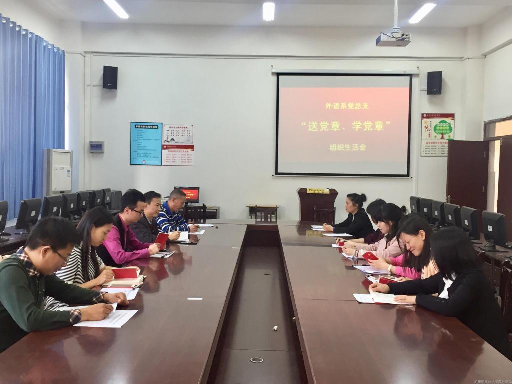 4月16日,外语系党总支在3420召开组织生活会,开展“送党章、学党章”活动,全体党员教师参加了会议。会上,外语系党总支书记梁杰亲自将党章送到每名党员的手中,教工支部书记刘永丽对党章修改和增加的内容进行了重点...[详细]